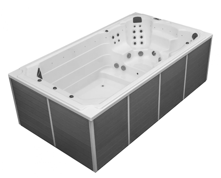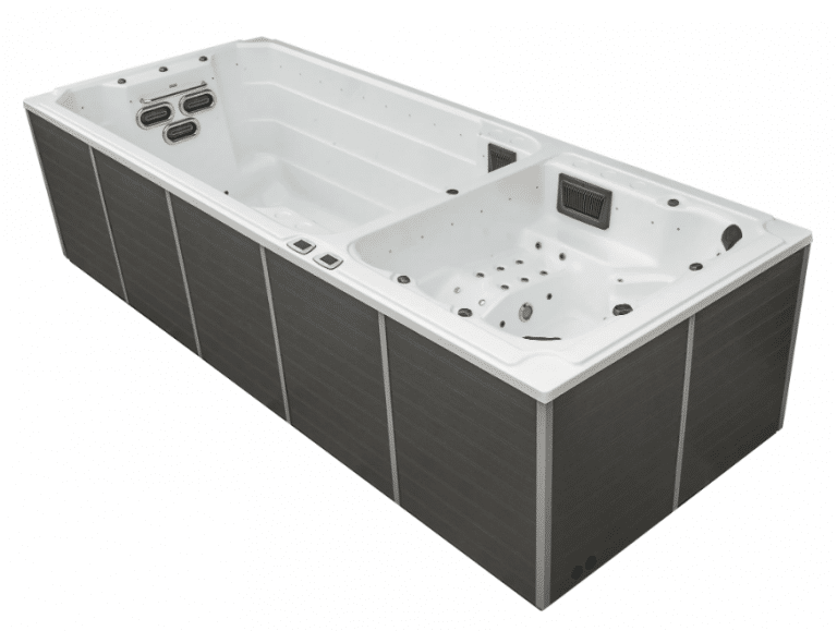 Mit einem Swim Spa von Waterwave Spas® erhalten Sie einen ganzjährig nutzbaren Swimming-Pool mit einer leistungsstarken Gegenstromanlage und einem Entspannungsbereich. In einem getrennten Swim Spa, einem 2-Zonen Swim Spa relaxen und genießen Sie die Hydromassage sogar in einem getrennten Whirlpoolbereich. Schwimmen, Aqua-Fitness, Erholung und Massage…